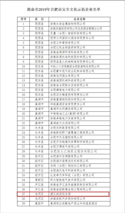 2020年新年伊始,渡江战役纪念馆(安徽名人馆)管理处又一荣誉加冕。在合肥市安全生产委员会近日公布的“2019年合肥市安全文化示范企业”名单中,渡江战役纪念馆光荣登榜。据了解,渡江战役纪念馆是此次公布名单中唯一一家公共场馆单位,也是全省首家获得“安全文化示范企业”荣誉称号的公共场馆单位。
