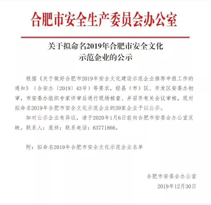2020年新年伊始,渡江战役纪念馆(安徽名人馆)管理处又一荣誉加冕。在合肥市安全生产委员会近日公布的“2019年合肥市安全文化示范企业”名单中,渡江战役纪念馆光荣登榜。据了解,渡江战役纪念馆是此次公布名单中唯一一家公共场馆单位,也是全省首家获得“安全文化示范企业”荣誉称号的公共场馆单位。